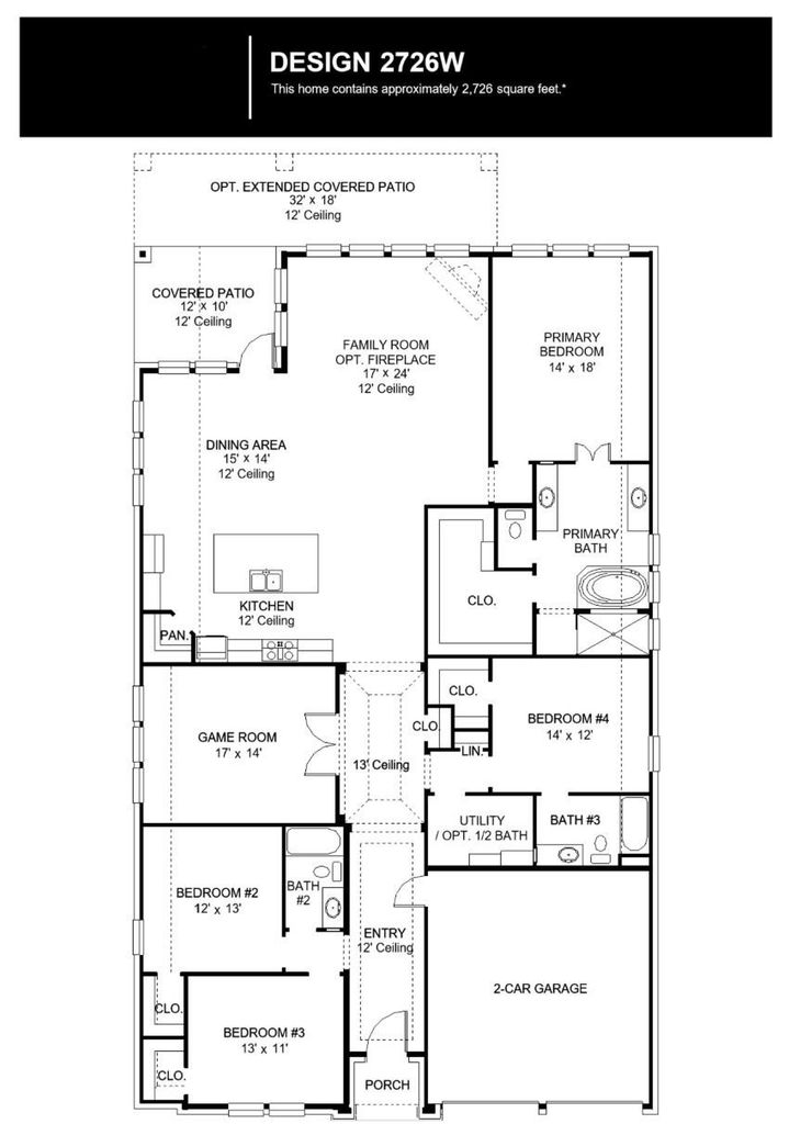Entry welcomes with 12-foot ceiling. Game room off extended entry with 13-foot coffered ceiling. Spacious family room with wall of windows opens to kitchen and dining area. Kitchen offers corner walk-in pantry and inviting island with built-in seating space. Primary suite includes bedroom with wall of windows. Double doors lead to primary bath with dual vanities, garden tub, separate glass-enclosed shower and large walk-in closet. A guest suite with private bath adds to this four-bedroom design. Covered backyard patio. Two-car garage.