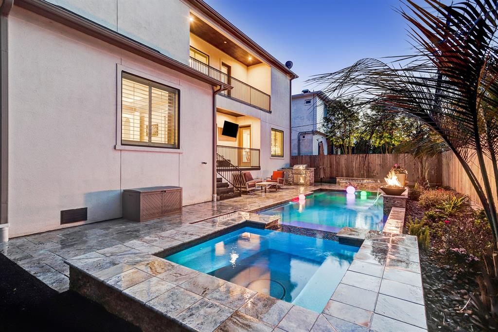 A desirable lifestyle awaits with this spacious backyard with covered patio, large pool, Summer Kitchen & built-in firepit. The downstairs Owners’ Retreat features views of the beautiful backyard, wood floors, huge bathroom w/ double shower & oversized closet. The Kitchen features all Thermador appliances (including built-in fridge w/ ice & water dispenser and 48” gas range w/ griddle), Butler’s Pantry w/ 2 dual temp. wine fridges & walk-in pantry. Second floor features 4 spacious Secondary Bedrooms, huge Game Room w/ balcony access & Media Room. The Backyard Oasis features a sports pool w/ 5 water features & 2 fire features, upgraded Pebble Tec plaster & sun shelf, spa w/ variable jet speeds, oversized firepit w/ built-in seating & Summer Kitchen. Other features include: built-in speakers, solid core doors, epoxy floors in Garage & tons of storage. Fantastic walkability to neighborhood features & convenient commute to TMC & key business areas. All per seller.