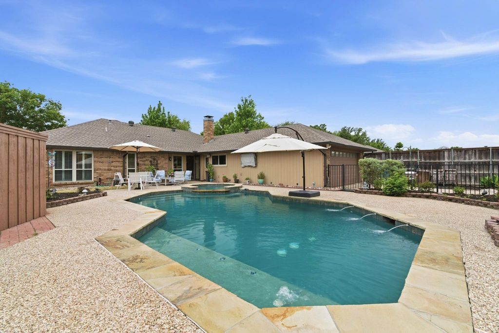 One story brick home located in a well established Carrollton neighborhood with mature trees and a quiet setting. The backyard features a heated saltwater pool with attached spa, water features, and integrated lighting. The pool system can be controlled from your smartphone for added convenience. An outdoor TV setup creates a functional space for entertaining, while additional concrete storage on the side of the home provides room for equipment and outdoor items. A sliding electric gate offers added privacy and extra parking. Inside, the home features laminate flooring throughout with ceramic tile in the kitchen. The layout offers comfortable living spaces with a practical flow for everyday use. Conveniently located with easy access to major highways, shopping, and dining.