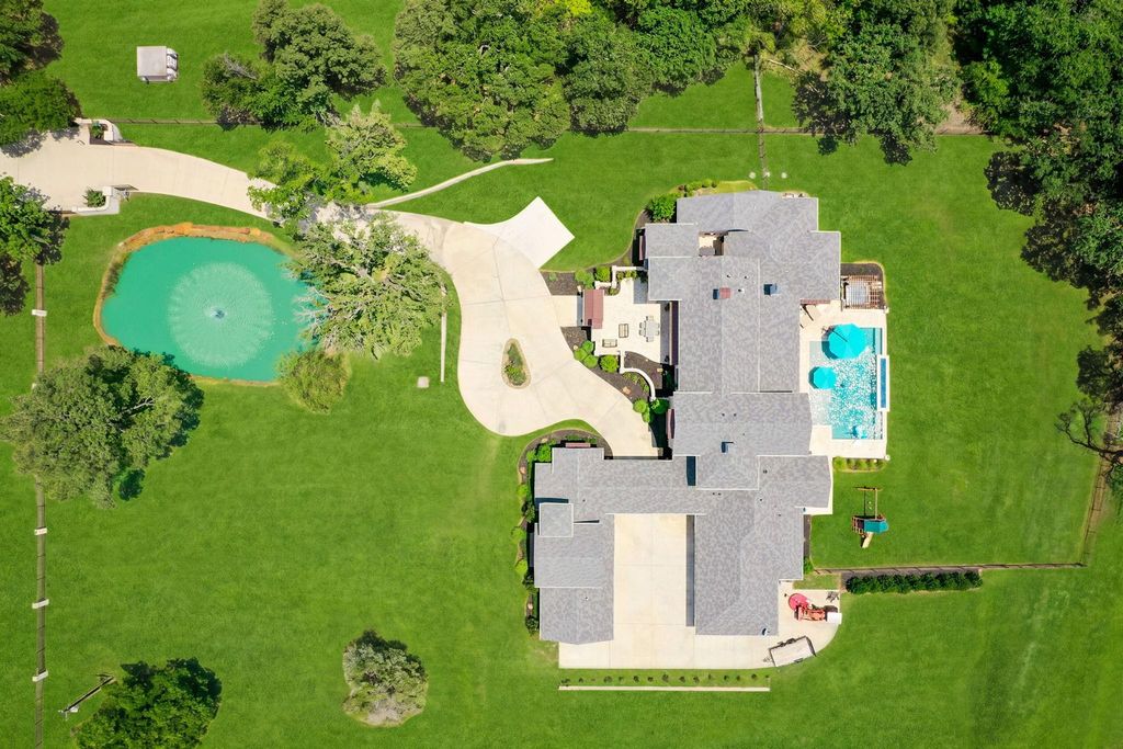 Stunning multigenerational estate on 6.29 private acres blends luxury craftsmanship with resort-style living. The open-concept main hall seamlessly connects the kitchen, living, dining, and breakfast areas. This fully equipped dream kitchen includes Thermador appliances, dual farmhouse sinks, dual dishwashers, and built-in Miele coffee system. The main residence features 4 bedrooms with ensuite baths, including a spacious primary suite with separate his-and-hers closets, laundry, folding station, and vanity. Just off the foyer, a serene study with cathedral ceiling opens to its own paver courtyard with cafe lighting. Designed for exceptional indoor-outdoor entertaining, this home features a front paver courtyard with fireplace, front and rear balconies, a large covered patio equipped with drop screens, accordion style glass doors, an outdoor kitchen, and multiple fire features. The main level game-media room offers direct pool and patio access and includes a wet bar and beverage station, while the heated pool and spa complete the unmatched outdoor living experience. Interior finishes include expansive kitchen island, solid 8” white oak hand scraped hardwood flooring throughout main areas, and tile in wet areas. Additional highlights include whole-home audio, LED lighting throughout, hard-wired security cameras, water purification system, and four tankless water heaters. The guest house main level includes living area, full kitchen, full bath, while the second level features a spacious bedroom with laundry—ideal for extended stays or multigenerational living. The property includes two ponds with a water feature in front, a well-fed irrigation system, and a mix of cleared and wooded land. Car collectors will appreciate the 6 garage bays with climate control and one pass-through door.