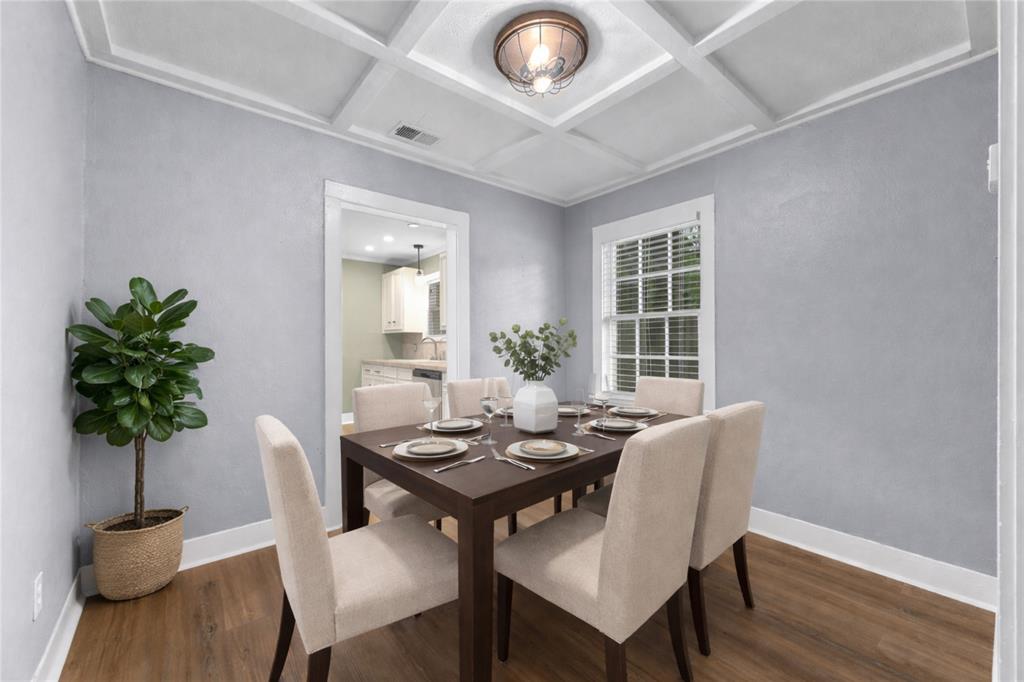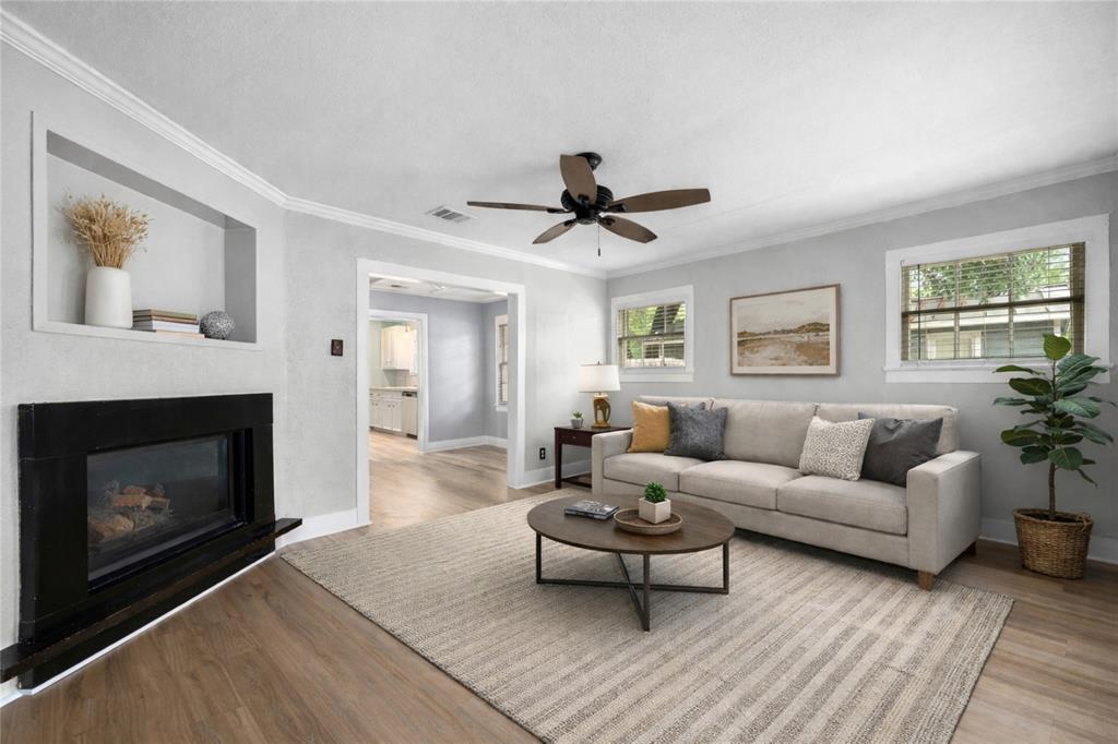 Perfectly positioned in a prime Georgetown location just steps from the historic Square, this rare three-bedroom, two-bath mid-century home offers timeless character with everyday convenience. As you arrive, you will be welcomed by a mature tree and a relaxing front porch with a swing. Inside, the thoughtfully designed floor plan is filled with natural light and features beautiful wood-look luxury vinyl plank flooring throughout the living areas and bedrooms—no carpet for a modern look and easy cleaning. The inviting living room centers around a cozy fireplace, while the kitchen features tile countertops, stainless steel appliances, and white cabinetry with convenient pull-out drawers. The dining area is elevated by a stylish flat coffered ceiling. The primary suite offers a generously sized walk-in closet and direct access to the backyard. Two additional bedrooms provide flexibility for guests or a home office, with one featuring its own ensuite bath. The fenced backyard is complete with a large deck shaded by mature trees. A detached garage/storage space adds extra functionality. Just a short walk brings you to the vibrant Georgetown Square, where you can enjoy shopping, dining, and recreation. The property is conveniently within walking distance to the elementary school and Southwestern University, with easy access to I-35, Highway 29, and TX-130.