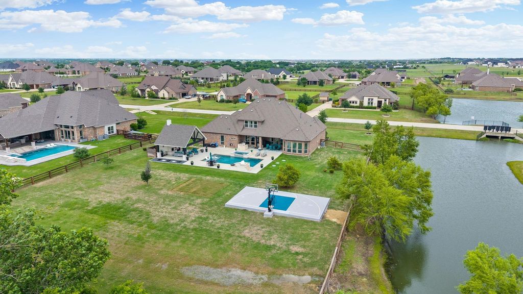 Exquisite luxury living in the highly acclaimed Argyle ISD! This impeccably maintained residence showcases refined design, soaring ceilings, and upscale finishes throughout, now enhanced with brand new carpet for a fresh, move-in-ready feel. Thoughtfully designed for both comfort and elegance, the home features 4 bedrooms on the main level in a split arrangement, complemented by 4 full baths and 1 half bath. Sophisticated entertaining spaces include a formal dining room, a private executive office, and an expansive upstairs bonus room with its own bath. At the heart of the home, the open-concept living area flows seamlessly into a chef-inspired kitchen outfitted with an oversized island, granite countertops, stainless steel appliances, double ovens, and a 5-burner gas cooktop—perfectly designed for both everyday living and elevated entertaining. A gas fireplace adds warmth and ambiance to the main living space. Step outside to a true resort-style backyard retreat featuring a spacious covered patio, an outdoor living cabana with a wood-burning fireplace, a sparkling pool, and a sport court—creating the ultimate setting for entertaining. Enjoy serene views and added privacy with no rear neighbors. This is the best lot in the neighborhood positioned right next to one of the ponds! Ideally positioned near premier shopping, dining, and major thoroughfares, this exceptional home offers the perfect blend of luxury, comfort, and convenience. Virtual tour and floorplans in the transaction desk.
