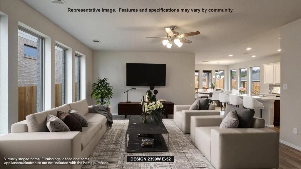 Front porch with two-story entry. Large family room with a wall of windows. Home office with French-door entry is just off the family room. Island kitchen with built-in seating space, a 5-burner gas cooktop, and a corner walk-in pantry opens to the dining area. Secluded primary suite. The primary bath offers dual vanities, a walk-in closet, and a large glass-enclosed shower. The second level offers a large game room with a wall of windows, secondary bedrooms with walk-in closets, a full bathroom, and a linen closet. Covered backyard patio. Utility room just off two-car garage.