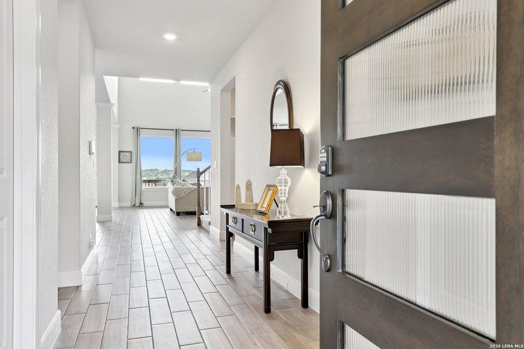 25330 Donahue Dr, San Antonio TX 78255Welcome to 25330 Donahue Dr - where stunning design meets breathtaking views in one of San Antonio's most sought-after northwest communities. This exceptional 4-bedroom, 3.5-bathroom, 3,035 sq ft home makes an unforgettable first impression with its striking limestone and brick exterior, lush manicured landscaping, and a showstopping designer front door featuring ribbed glass panels.Step inside to a gracious foyer with soaring ceilings and wood-look tile flooring that flows seamlessly throughout the main living areas. The heart of the home is the dramatic two-story living room - a true architectural statement with towering ceilings, clerestory windows that bathe the space in natural light, and a stunning white stacked-stone fireplace framed by an ornate carved white mantel. Floor-to-ceiling windows frame sweeping hill country and city views that are absolutely unmatched.An elegant open staircase with white balusters and a rich dark walnut handrail