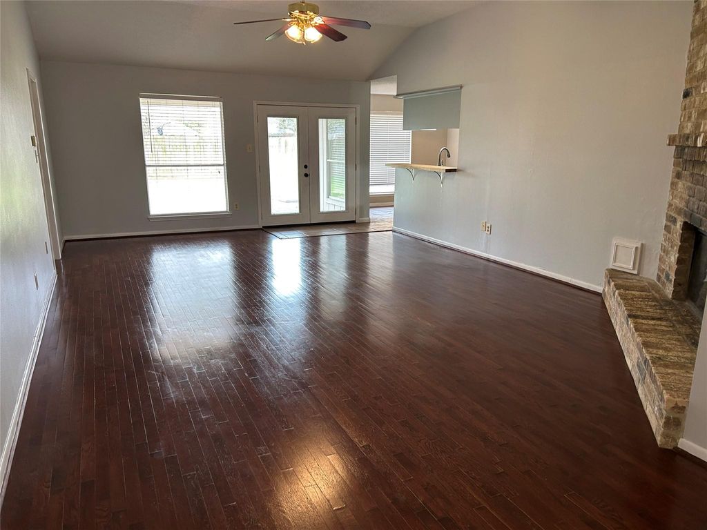 Wonderful open floor plan. Large one living area with cathedral ceiling and ceiling fan. Oversized master bedroom with a sitting area large enough for a sofa or small home office. Split bedroom floor plan-master on one side of home-tow bedrooms on opposite side.Hard surface flooring throughout. No carpet. Spacious and fenced back yard. No neighbors behind home-backs to drainage ditch and bicycle/ walking/jogging path. Easy access to I-10, Grand Parkway, local shopping, dining, and short drive to Katy Mills mall.