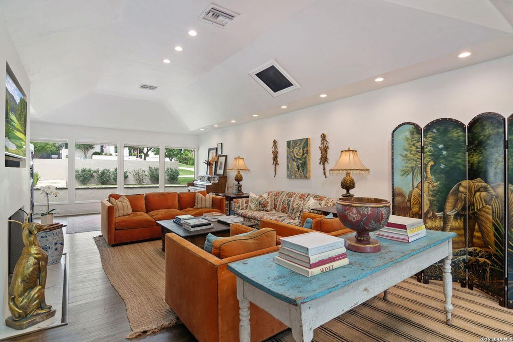 A beautifully updated Terrell Hills home offering privacy, flexibility, and effortless living in AHISD. Move-in ready and reimagined in a Spanish transitional, ranch-style aesthetic, this residence blends timeless character with modern upgrades on a grand, established block. Thoughtful landscaping and a substantial partial front wall create privacy with a refined street presence, while the setting itself offers a rare sense of scale and quiet within one of the area's most desirable streets. Inside, abundant natural light defines the home. Walls of windows frame serene, tree-filled views, creating a sense of calm and connection to the outdoors throughout. The second floor offers a unique treetop perspective, enhancing the home's tranquil, elevated feel. Light-filled living and dining spaces flow seamlessly, designed for both everyday living and entertaining. A dedicated bar area enhances the home's hosting appeal. The chef's kitchen features Sub-Zero appliances, a Jenn-Air 6 bu