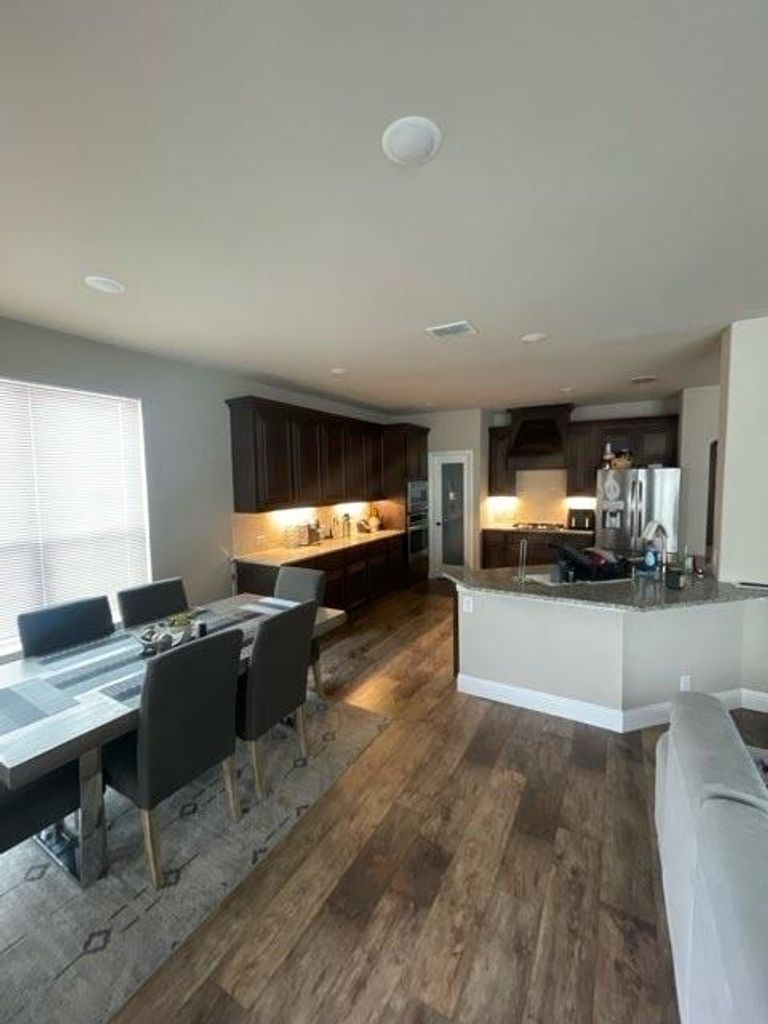 Welcome to this stunning and spacious 3,241-square-foot home located in the desirable and newer Ridge Ranch community. This meticulously maintained residence features five large bedrooms, three full bathrooms, and one half-bath, offering a versatile floor plan perfect for modern living. Situated on a prime corner lot, the home boasts impressive curb appeal with its brick and stone exterior and an inviting interior highlighted by laminate wood flooring, a stone wood-burning fireplace, and a gourmet kitchen complete with updated countertops, stainless steel appliances, and a massive walk-in pantry. The private primary suite is conveniently located downstairs, while the upper-level houses additional bedrooms, and an expansive game room for extra living space. The Ridge Ranch subdivision offers an exceptional lifestyle with top-tier amenities including a community pool, a playground, and scenic walking and jogging trails for outdoor enthusiasts. This community is perfectly positioned near local parks and within the highly-regarded Mesquite Independent School District. Outside, the property is finished with an extended covered patio, making it the perfect retreat for relaxing or entertaining guests.