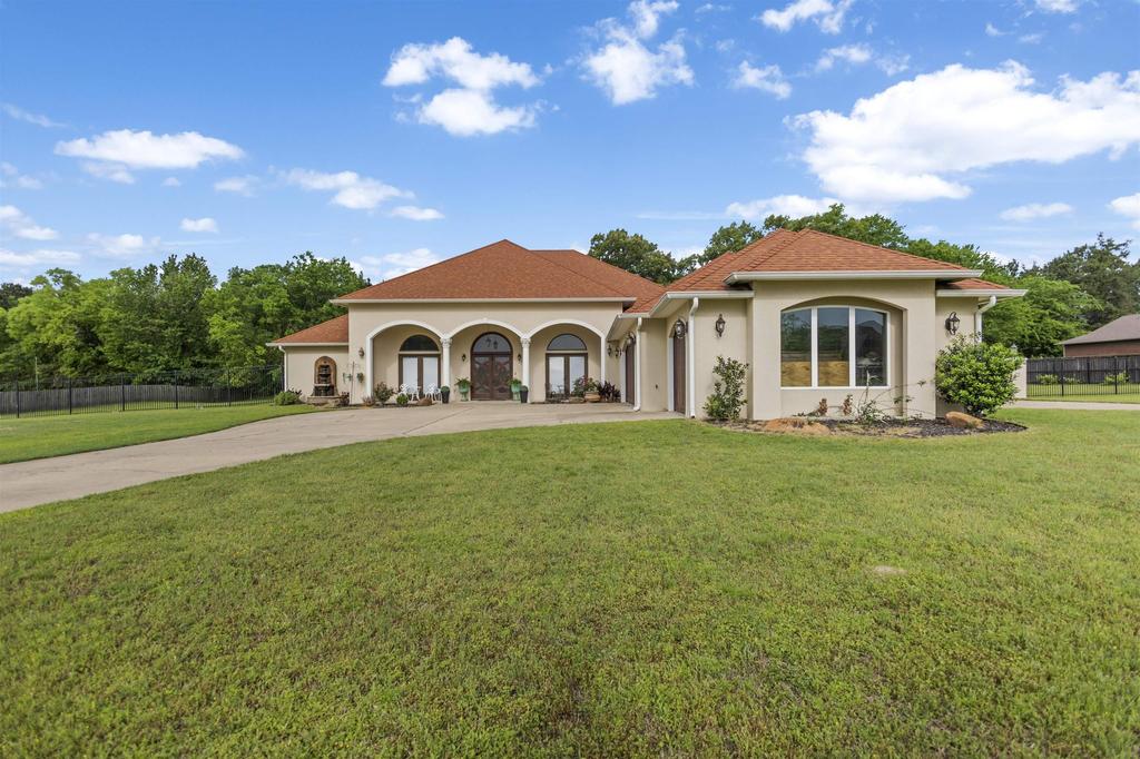 Mediterranean elegance meets modern functionality. This 2010-built, 4-bedroom home offers approximately 2,923 sq ft on 1.32 acres, with a marble-floor entry, soaring ceilings, and a custom double-door with an arched transom. The layout flows seamlessly from the formal dining room into a spacious living area and kitchen, featuring granite countertops, a 5-burner gas cooktop, and an oven with microwave/convection settings. A flex room with built-in shelving off the living space provides options for a study or extra bedroom. Bamboo flooring runs throughout the living areas and bedrooms. The primary suite is a sanctuary with a tray ceiling, walk-in closet, and a main bath showcasing columns, travertine flooring, a double granite vanity with travertine basins, a deep jetted tub, and a walk-in shower finished in marble and river rock. A half bath features an onyx wash basin, and the guest wing includes a Jack-and-Jill full bath with marble flooring and vanity, plus another half bath serving the rear guest room and the outdoor area. Outdoors, entertain on the patio with a tongue-and-groove wood ceiling over the fully equipped kitchen (granite bar, grill and sink). The property offers a drive-through 3-car garage with cedar doors, and a 720?sq?ft workshop with its own half bath with RV hookup, and a fenced yard with a pergola. With open living spaces, high-end finishes, and indoor