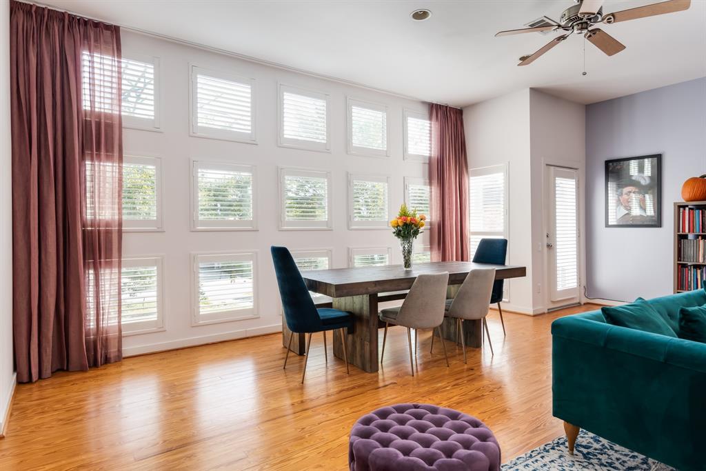 Gorgeous Rice Military home, that is 1-2 blocks from HEB, restaurants and retail. Lot's of upgrades including custom shutters throughout, hardwoods, zero carpet, fresh paint and much more. Huge living area on the 2nd floor with an open concept den and kitchen with a large amount of natural light that arrives from the east. The first floor offers a guest suite with a full bath. Primary bedroom has a vaulted ceiling, private balcony, spacious bath and a large walk-in closet. The 3rd floor also features a small office/study space outside the primary bedroom. The backyard green space is private, large enough for small parties and is accompanied by a sitting area and privacy fence. No HOA for this street and parking for guest along Rose St. and Olive St. Call the showing service for a private showing!