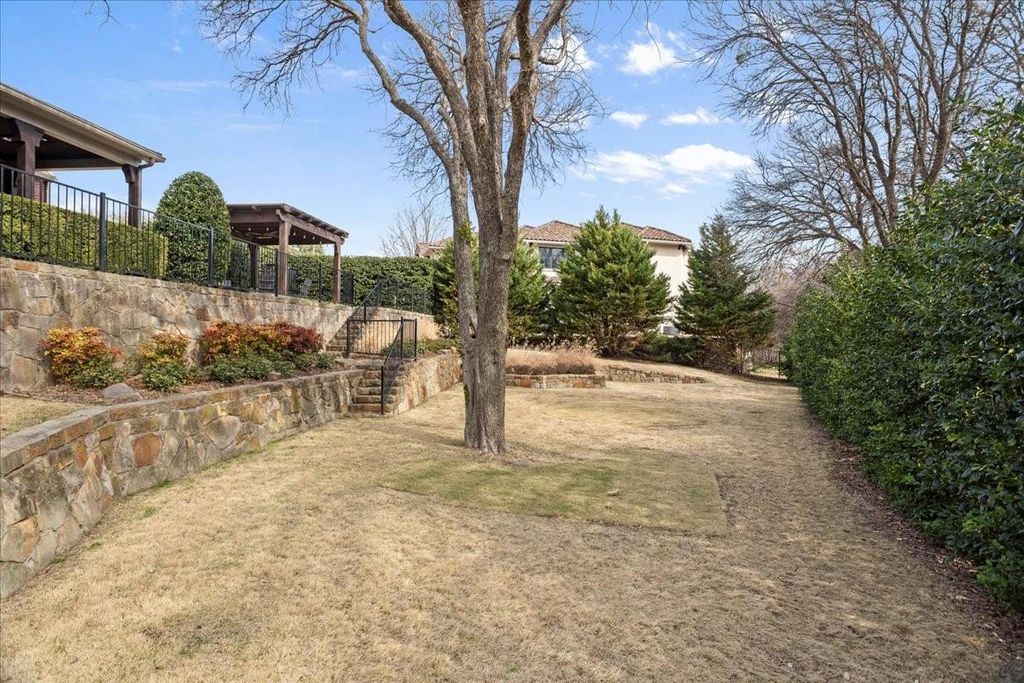 This stunning Tudor style home is located on a prime corner lot in the guarded, gated community of Mira Vista. Beautifully remodeled in 2023, this home blends timeless charm with modern updates. The magnificent living room features gorgeous cathedral ceilings with wood beams and a dramatic stone fireplace, opening to an inviting floor plan ideal for entertaining. The updated kitchen offers quartz countertops, gas cooktop, and abundant storage. The primary suite includes double vanities, a large relaxing garden tub and walk-in closet. A private guest suite with en-suite bath is also located downstairs, along with a laundry room and half bath for guests. Upstairs features two generous bedrooms with Jack and-Jill bath, a private home office, a large game room, and walk-in storage space. The backyard is an entertainers dream with a covered patio, outdoor kitchen, stone decking, pergola, multiple seating areas and a putting green. The beautifully landscaped yard offers a spacious amount of green space and backs up to a peaceful resident nature trail offering scenic surroundings.