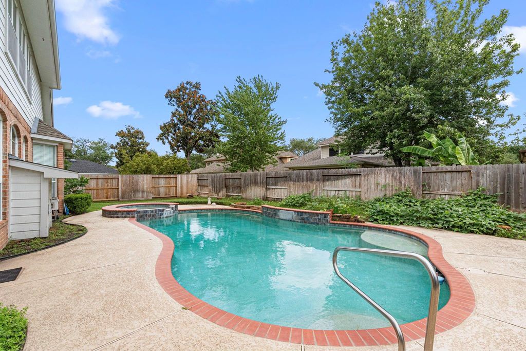 Desireable floorplan with two bedrooms and two full baths down and 3 living spaces! On a cul-de-sac with large pool and spa! Family room has a tile floor, fireplace, and opens to the neutral kitchen which has stainless steel appliances and pendant lighting. Second staircase off kitchen! Spacious primary bedroom has a bay window and view of pool. The primary bathroom has been remodeled with an oversized shower with glass enclosure and designer tile, new vanity and mirrors, and beautiful floor tile. Primary closet has amazing shelving system and a window for natural light. The second downstairs bedroom has engineered wood flooring and would be great as a private office. Laundry room has a sink! Roof replaced 2021 and foundation repaired August, 2025. This home is walking/biking distance to Sartartia Middle School.