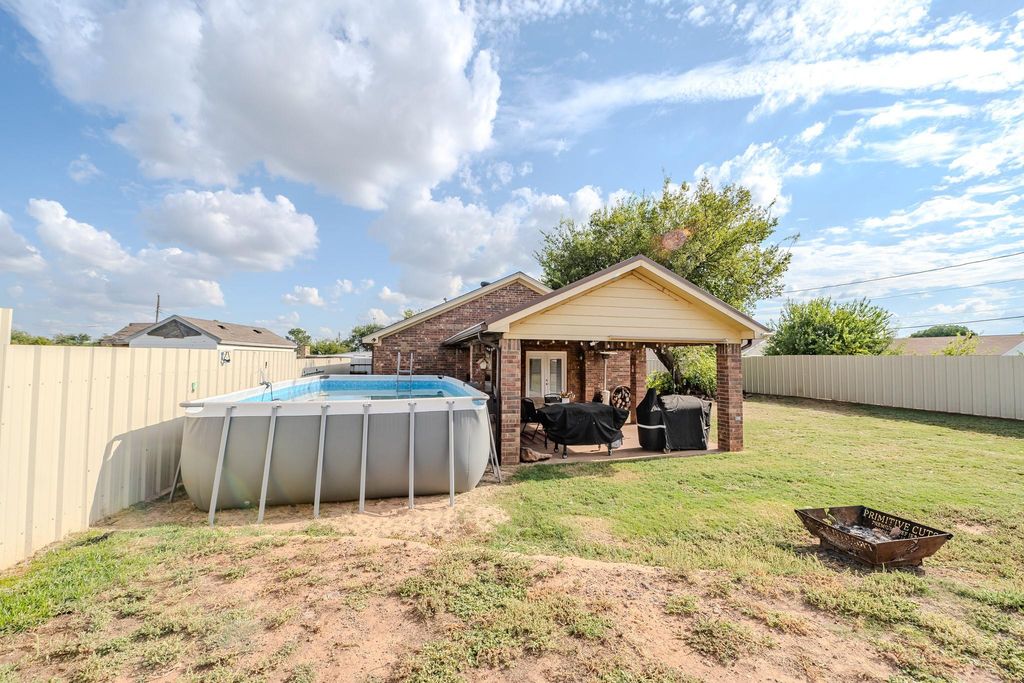 Welcome to a charming 3-bedroom, 2-bath home located in a peaceful neighborhood close to local businesses, a park, and amenities. The home features an open-concept floor plan, granite countertops, and a cozy fireplace perfect for relaxing evenings. Enjoy outdoor living with an open patio, above-ground pool, and a decorative privacy fence for added seclusion. Bonus, the TV outside stays. All stainless appliances stay including the washer and dryer- what a convenience. A security system is already installed for your peace of mind. The circular driveway provides front door parking, and the storage building adds more room for storing your belongings. Another bonus- this home is approximately 5 minutes from Sheppard Air Force Base!! A great combination of comfort, location, and functionality—move-in ready and waiting for its next owner! New roof coming and will be replaced prior to closing.