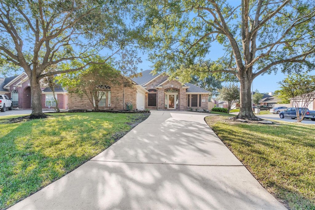 Spectacular! 4 bedroom one story home on a corner lot w/ circle drive just off Louetta Rd in Devonshire Woods. Welcome! Impressive entry w/ formal dining to the right. Spacious family room w/ gas log fireplace, high ceilings, wood floors & a wall of windows looking out to the backyard. Island kitchen is a chefs delight w/ gas cooktop & oven, desk area & open to breakfast area. Roomy primary BR w/ vaulted ceilings, double door linen closet. Spa like primary bath w/ soaking tub, separate shower, two vanities & a ginormous walk-in closet (13'x5'). Three more BRs off hallway to the other side of family room. Secondary bath has double sink vanity w/ tub & toilet area separated by door. Large laundry indoors. Garage has extra storage area built-in Beautiful backyard w/ 26x14 patio & gas grill. Freshly painted inside and out. Roof 1 yr, HVAC 3 yr. Centrally Located to I-45, Grand Pkwy, Hardy Toll, Sam Houston Pkwy. Klein ISD. Beautiful park w/ trails, courts, pool & playground