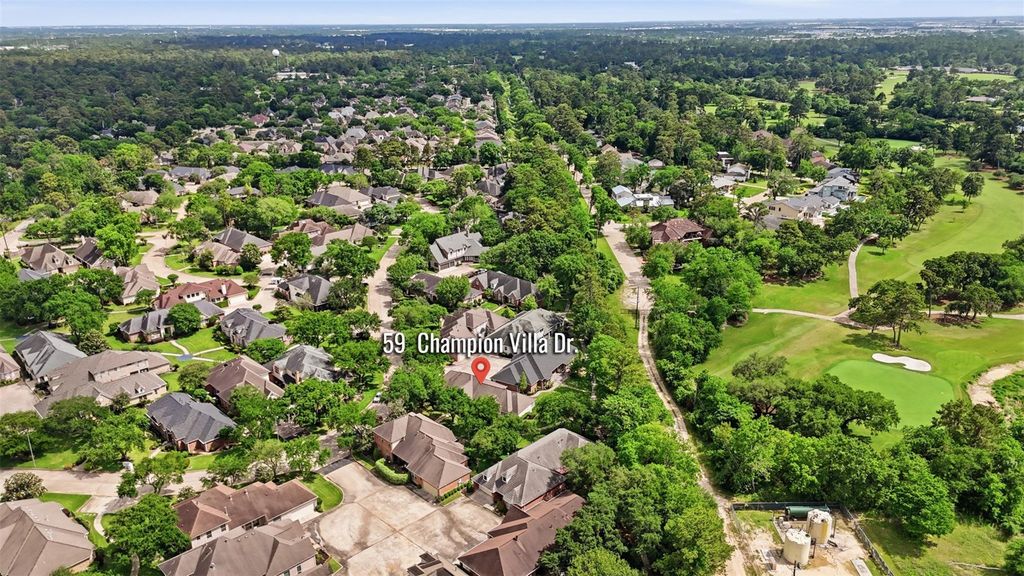 This exquisite all-brick custom ranch patio home in the gated Champion Forest Villas community offers the perfect mix of spaciousness and park-like view landscaping. The grand entrance leads to high ceilings with crown molding, large plank wood tile floors throughout, & stunning light fixtures. Elegant formal dining area flows into a gourmet kitchen featuring tall white shaker cabinets, soft-close doors & drawers, quartz counters, deep undermount sinks, stainless steel double ovens, built-in gas range, microwave, and walk-in pantry. The kitchen opens to a casual dining space and dramatic family room with high ceilings, stone fireplace, and walls of windows. The huge private primary suite boasts vaulted ceilings, a spa-like bathroom with a walk-in seamless glass shower, freestanding soaking tub, custom fixtures, his-and-hers quartz vanities, and a massive walk-in closet. The guest bathroom offers double sinks, a quartz vanity, and serves two large bedrooms. Plus, a lovely patio to enjoy