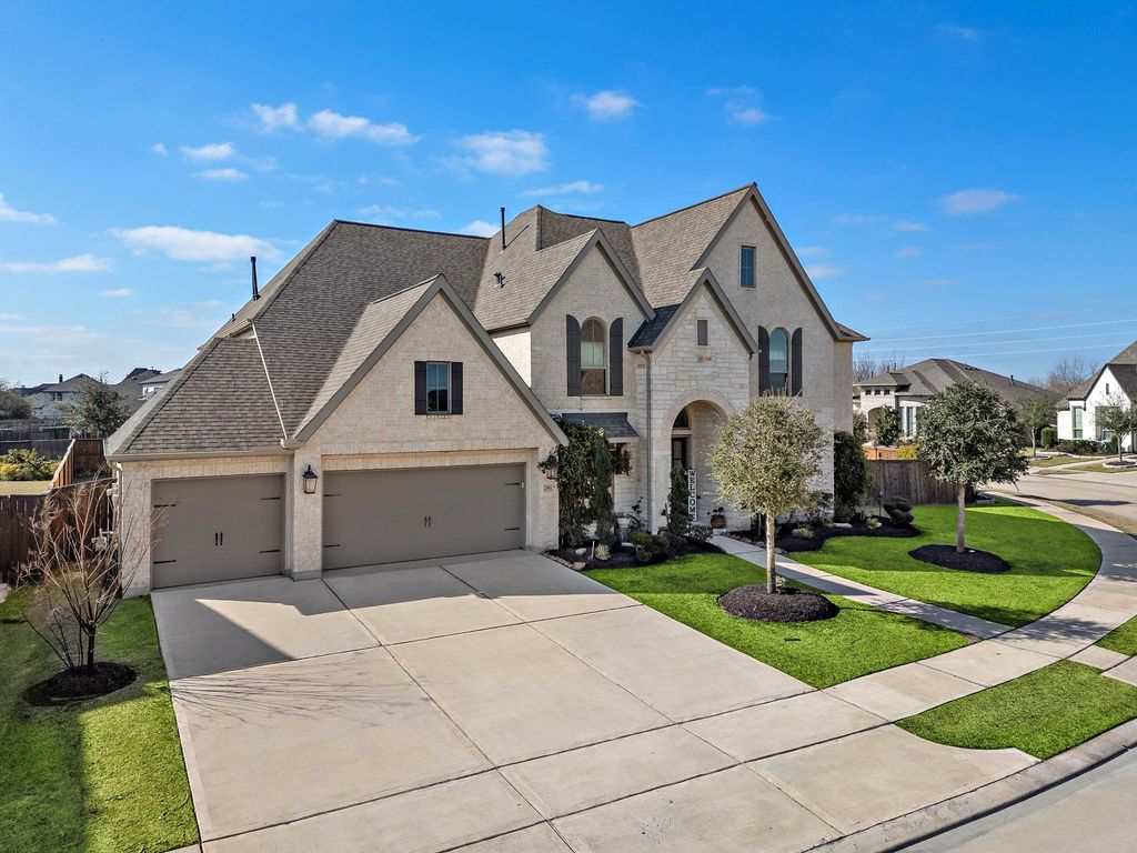 Luxury Living in the Gated Section of Cane Island! Stunning Corner Lot! This beautiful 5 BR, 4.5-bath home with a rare 4-car garage sits on a 15,000+ sq. ft. lot. A grand two-story entry with a curved staircase welcomes you inside. The open-concept living area features soaring ceilings, a stone fireplace, floating wood shelves, custom drapes, and an angled wall of windows that fills the home with natural light. The layout offers two bedrooms on the first floor, ideal for guests or multi-generational living. The primary suite includes a curved wall of windows, stained wainscoting, and hardwood floors. Upstairs features a spacious game room, theater/media room, and Hollywood bath. Abundant storage and closet space make this home as functional as it is beautiful.