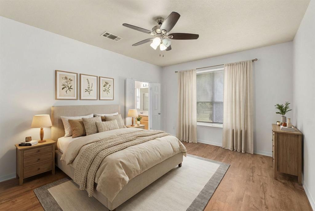 The generously sized primary suite is conveniently located near the laundry room and includes an en-suite bath with double sinks, a walk-in closet, separate shower and garden tub, plus a private toilet room for added comfort.