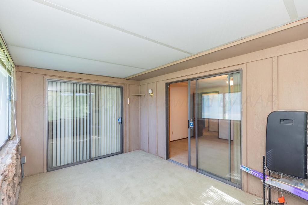 Country living 4 miles from shopping center! One-acre property with mature trees & beautiful brick-and-glass living space. Huge living room with wood burning fireplace, spacious kitchen/dining with new light fixtures & alcove for tv visible from both rooms, separate pantry and laundry room with included washer & dryer. Ground-level EF-5 storm shelter with interior access from office, 3 generously-sized bedrooms with glass doors to either sunroom or backyard, & 2 double-sink bathrooms. Pet doors to yard & extra sink for quick pet clean-up. Walk-in closets, kitchen/bath/linen cabinets galore. Covered patio, two-car garage with additional furnace/well room, large storage shed, sprinkler system.