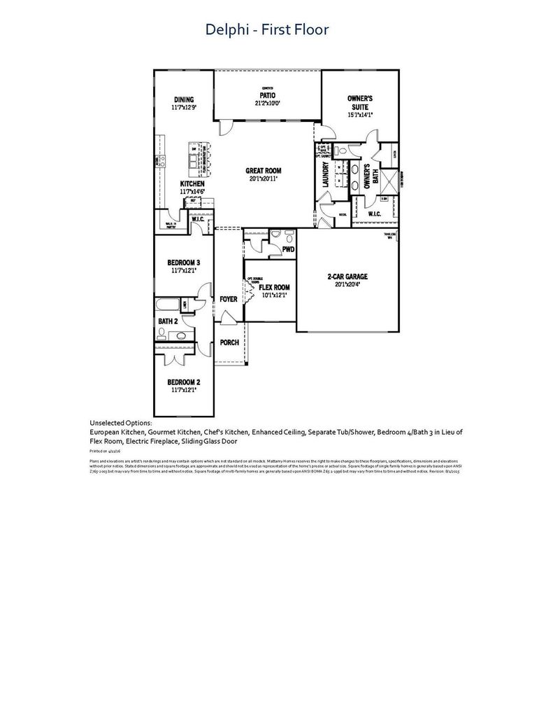 Built by Mattamy Homes - The Delphi - Available Now! Delphi greets you with a thoughtful design that seamlessly transitions from the foyer into the Great Room. Near the entry, you'll find two bedrooms and a versatile flex room, with a powder room conveniently across the way. The flex room can be easily converted into an office with optional double doors. The Great Room featuring an electric fire place flows into an open kitchen and dining area, creating an inviting space for gatherings. The heart of this home is the spacious kitchen featuring a walk-in pantry, stylish island with breakfast bar, and ample storage. The owner’s suite, tucked away at the rear, offers a private and tranquil retreat, ensuring comfort and separation from the front bedrooms. The Delphi also boasts a covered patio, perfect for outdoor relaxation. Experience the perfect blend of style and functionality with The Delphi, where every detail is designed to enhance your living experience. This home features ENERGY STAR® certified Whirlpool® appliances, Energy-efficient tankless water heater, and Ecobee smart thermostat.