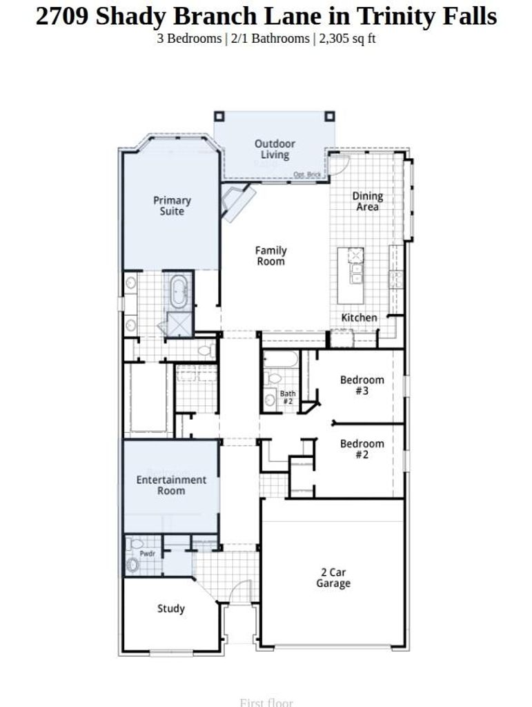 Elevation R, primary bath with contemporary freestanding tub & separate shower, entertainment room with powder bath in lieu of bedroom 4 & storage, bay window option in primary bedroom! Extended covered patio & 5' in depth added to garage! Light brick upgrade, white windows & black shingles. Brick fireplace extended to 10'!