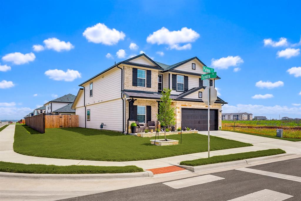 Welcome to this stunning custom-built home, completed in 2025 and thoughtfully upgraded throughout. Situated on a desirable corner lot, this 5-bedroom, 2 full bath, and 1 half bath residence offers 2,741 square feet of well-designed living space in a growing new construction community. Step inside to an open-concept layout featuring a spacious kitchen and living area, with a staircase that overlooks the main floor, creating a bright and inviting atmosphere. The extended kitchen island, glass pantry door, and added bar lighting enhance both functionality and style, making the space ideal for entertaining. The home showcases tile flooring throughout the downstairs, custom stair railing, and upgraded lighting fixtures in the upstairs bedrooms. Comfort and efficiency are top of mind with ceiling fans in every room, solar shades on upper living room windows, and blinds installed throughout. Additional upgrades include a reverse osmosis system, water softener, full indoor air quality (IAQ) HVAC system, CAT6 wiring to all TV outlets, and a complete security system. Outdoor features include an extended back patio, extended front patio with custom landscaping, and a 4-car garage equipped with openers, providing ample space for vehicles and storage. Located within Lockhart ISD and in a new construction HOA community, this home offers both modern convenience and long-term value. Warranties are still active and transfer with ownership. Priced under appraised value, this is an excellent opportunity to own a nearly new, highly upgraded home without the wait of building!