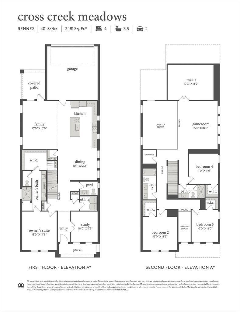 NORMANDY HOMES RENNES floor plan. The Rennes is a spacious home offering nearly 3,200 square feet of living space with four bedrooms and three and a half bathrooms. The main floor features a private owner's suite and a dedicated study, ideal for work or relaxation. The two-story family room creates a grand, open atmosphere perfect for gathering. Large gourmet kitchen open to the family room. Upstairs, a game room and media room provide additional space for entertainment. Each bedroom includes a walk-in closet, ensuring plenty of storage for everyone. Built with quality materials and smart design, this home delivers both style and durability at a great value, making it the perfect choice for those seeking an affordable home without compromising on craftsmanship. Come see for yourself!