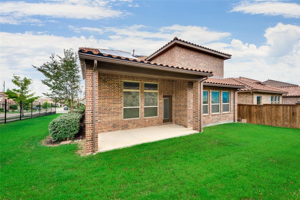 ISD. This two-story masterpiece, crowned with a durable tile roof, is designed for those who demand excellence in both education and lifestyle. The sophisticated interior greets you with soaring ceilings and rich wood flooring that flows through the primary living spaces. The intelligent layout features two full bedrooms and two bathrooms on the main level, providing a rare and flexible solution for guests or multi-generational needs. A private study and elegant formal dining room flank the entry, leading to an open-concept living area bathed in natural light. The chef-inspired kitchen is a true centerpiece, featuring expansive granite countertops, a social island, designer hardware, a walk-in pantry, and premium stainless steel appliances. Retreat to the primary suite, a spa-like sanctuary featuring a massive walk-in shower and a spacious closet. Upstairs, the home transforms into an entertainment hub with both a dedicated Media Room and a large Game Room, accompanied by two additional bedrooms and a full bath. Outdoor living is equally inviting with a manicured backyard and a charming patio perfect for evening relaxation. Value-conscious buyers will appreciate the integrated Solar Panels, offering a powerful defense against rising energy costs during the peak of Texas summers. Located in a quiet pocket of Irving, you are minutes away from I-35E, I-635, DFW Airport, and Dallas Love Field, ensuring an effortless commute to major employment hubs and world-class dining. This move-in-ready gem offers the prestige, location, and schools that relocating executives and families seek. Experience the quality of a David Weekley build—come tour this property today and move in just in time for summer!