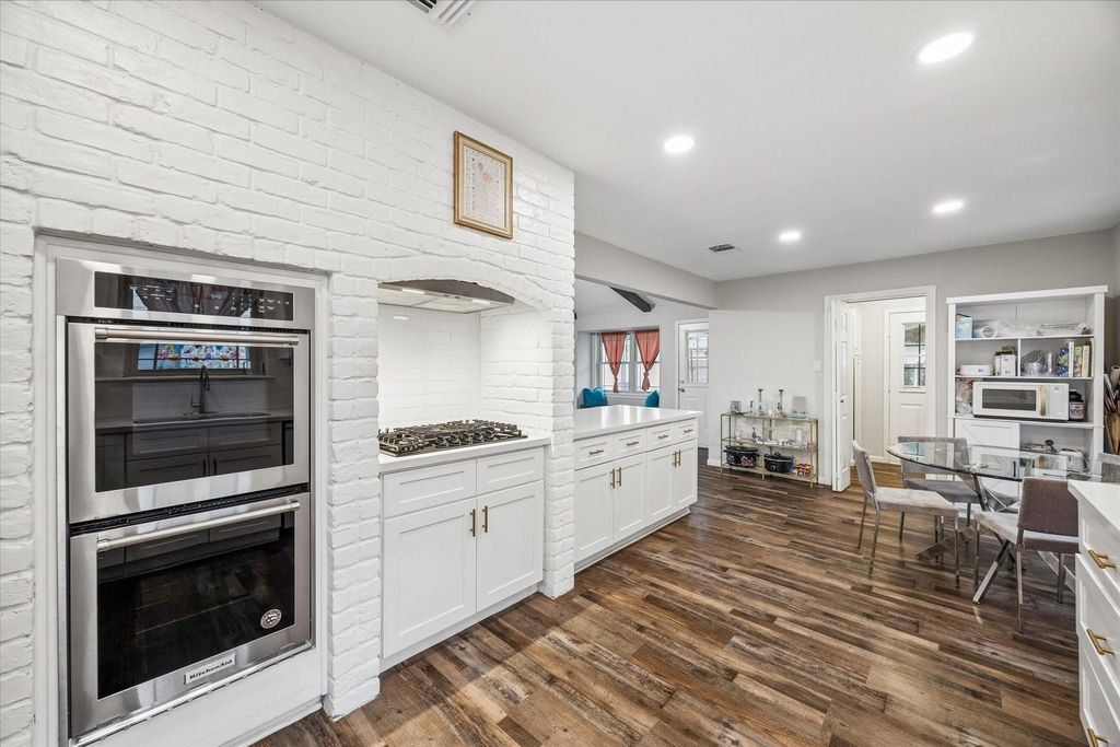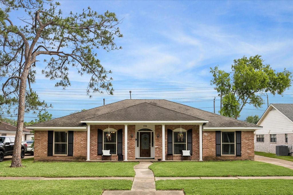 7711 Twin Hills Dr is listed for sale at $ 394,500. The Single-Family property has 4 bedrooms, 2 Full Bathrooms, 1 Half Bathroom, 2300 square feet and was built in 1969. The lot size is 8520 Square feet. ##BR##Nestled in the Maplewood West community, this REMODELED 4 bedroom, 2.5 bath, 1 story charming BRICK home invites you with its transitional and seamless floorplan. The updated chef’s kitchen is designed with an exposed brick cooking alcove above a gas cooktop, stainless steel DOUBLE OVENS, peninsula/breakfast bar, Bespoke SMART HOME appliances and soft closing drawers/cabinetry. Separate from the formal living, the den boasts vaulted wood beam ceilings, a cozy fireplace and built-in cubbies. The handsome dining is utilized as home office and breakfast room is adjacent to utility room and powder room. The spacious primary suite features dual walk-in closets, a large walk-in shower, and direct access to the backyard through sliding glass doors. Relax under the pergola, by your PRIVATE POOL and myriads of green space. The Jack and Jill secondary bath is accessible from 2/3 secondary beds. The 3rd secondary bed has ample closet space for storage and decluttering. Per Seller, the home has NEVER flooded.