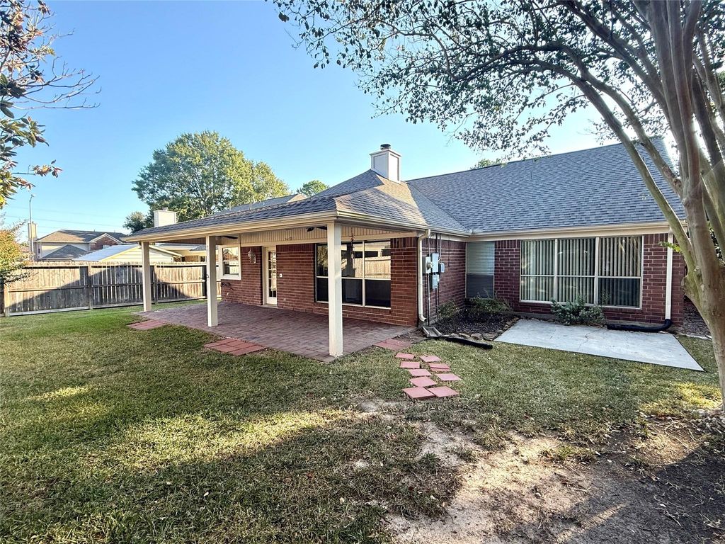 For Rent – Beautiful 3BR/2BA home with open living area, high ceilings, and cozy fireplace. The kitchen features granite countertops, wood cabinets, and plenty of natural light. Large primary bedroom with double sinks and walk-in closet. Enjoy a private backyard with covered patio, ceiling fans, and mature trees. Community pool, clubhouse, and parks nearby. Ready for move-in!
