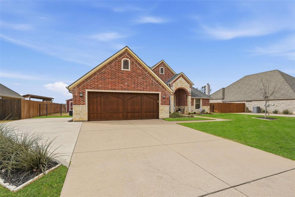 Charming single-story gem backing to a peaceful greenbelt, featuring a timeless brick and stone façade and a front two-car garage. Roof and 6-inch gutters replaced in May 2023. Step inside to an inviting, open floor plan highlighted by easy-to-maintain wood-look tile flooring throughout the main living areas and bedrooms. Just off the entry, a private study provides the perfect space for working from home. The spacious living room centers around a beautiful stone fireplace and flows seamlessly into the eat-in breakfast nook with bay windows overlooking the backyard. The gourmet kitchen offers granite countertops, a wraparound breakfast bar, center island, ample cabinetry, and an electric cooktop, ideal for both everyday living and entertaining. The large primary suite includes a cozy sitting area and a spa-like en-suite bath with dual sinks, a separate shower, garden tub, and walk-in closet. Two generously sized guest bedrooms complete the interior. Out back, enjoy a huge covered patio overlooking the expansive yard with a storage shed and serene greenbelt views, no neighbors behind you! Conveniently located on the Fort Worth side of town with quick access to H-E-B and just minutes to the sought after Downtown Granbury.