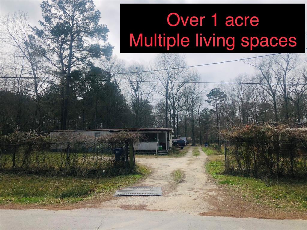 OVER 1 ACRE with multiple living spaces --- mobile home / house / shed with living space Mobile - one of the bedrooms was opened up to create a very large living area and very spacious dining/kitchen space. House - 2 bedrooms, 1 bathroom, living room, kitchen, and storage area. Shed - bedroom, bathroom, kitchenette, and huge attached storage area. Being sold AS IS HUGE yard with plenty of space to add your personal touches. Buyer to verify measurements.