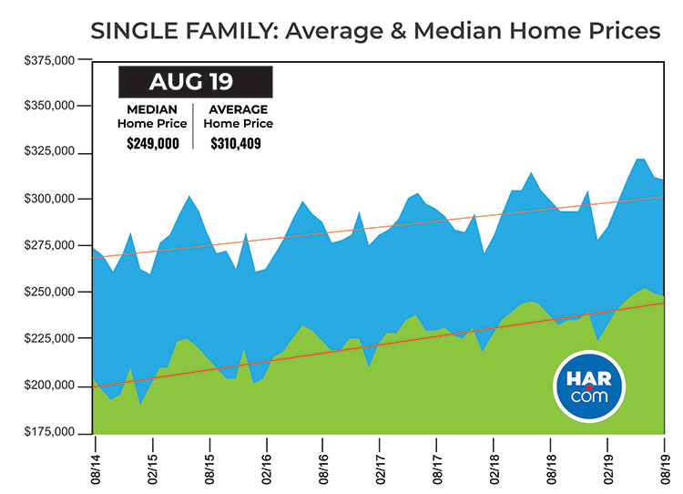 HOUSTON — (September 11, 2019) — Temperatures weren’t the only thing soaring in August. Home sales registered another hot month, as low mortgage interest rates kept consumers in a buying mood. According to the latest monthly report from the Houston Association of Realtors (HAR), August sales of single-family homes throughout greater Houston totaled 8,679. That is up 3.9 percent year-over-year and marks the second largest one-month sales volume of all time; the record of 8,930 was set just last month. On a year-to-date basis, home sales are running 3.1 percent ahead of 2018’s record volume.