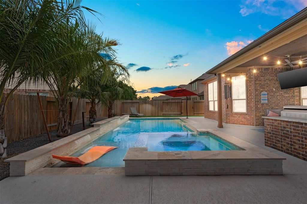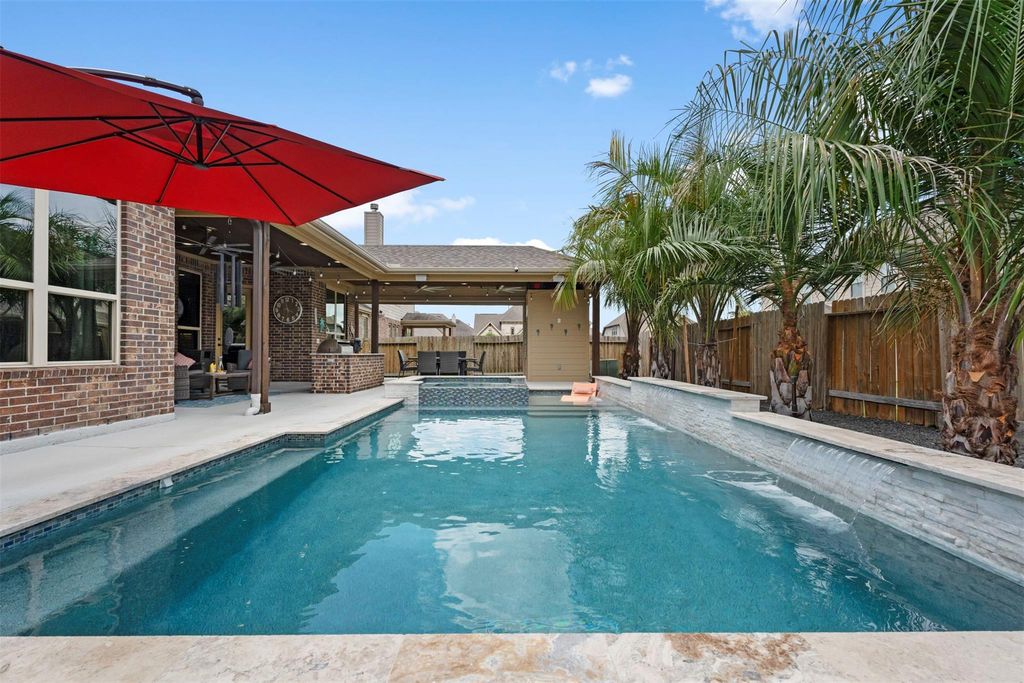 Timeless elegance with resort-style back yard! Stunning 4 BR, 3 full & 2 half bath home offers everything for comfortable living & entertaining. 3-car garage, dedicated study, game room, media room + both formal & casual dining areas. The showstopper is the backyard oasis with 2 covered patios, outdoor kitchen, tinted windows, sound system, pool/spa, pool bath, outdoor shower, artificial turf with built-in sprinklers to keep kids/pets cool + a whole home generator. Wood floors throughout (no carpet), family room with soaring ceilings & a floor-to-ceiling stone fireplace. Dedicated study with French doors for the perfect home office. The spa-like ensuite in the primary BR feels like a 5-star hotel. Upstairs offers a huge game room, multi-level theater room, 3 BR's (1 a true guest suite) & 2 full baths. Easy access to 99, 249, & 45. HOA amenities include a resort-style pool, tennis courts, trails, fishing pond & more. A MUST SEE! Floor plan attached.