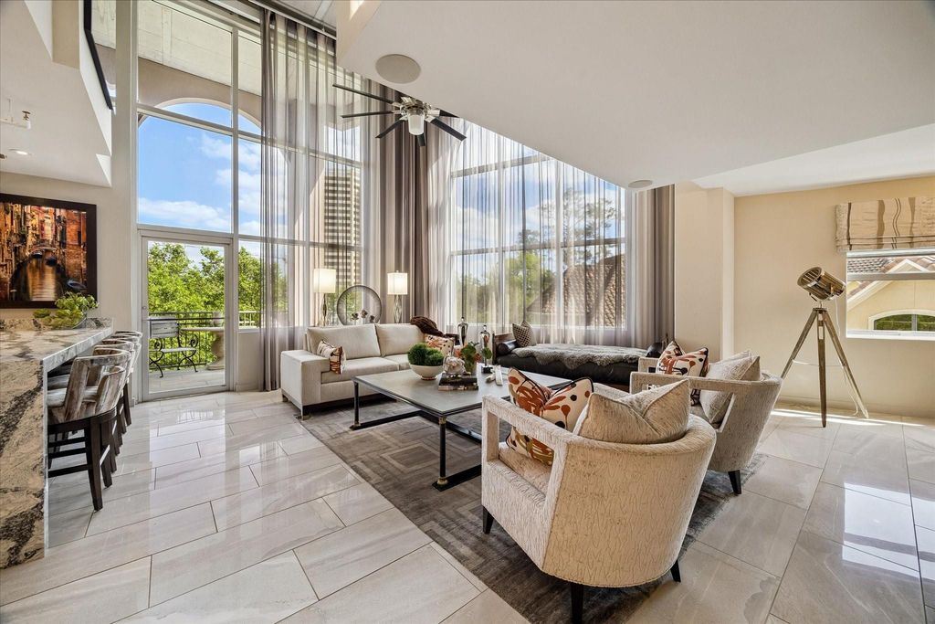 Beautifully designed residence in a prime location near Memorial Park, dining, and entertainment. Open-concept living, dining, and kitchen feature modern finishes, abundant light, and a spacious bar area, with a private balcony extending the living space outdoors. A dedicated wine room with seating offers a sophisticated entertaining space, while a separate cozy media area shares a fireplace that extends from the main living room. The main level includes a full bath. Upstairs, the primary suite features a sitting area, interior windows with motorized blackout shades, and a spa-like bath with dual vanities, walk-in shower, soaking tub, coffee bar, beverage refrigerator, and included TV. All bedrooms are en suite. Home automation controls lights, sound, televisions, motorized shades, and climate, complemented by an integrated sound system. Controlled-access building with two assigned parking spaces and a private EV charger.