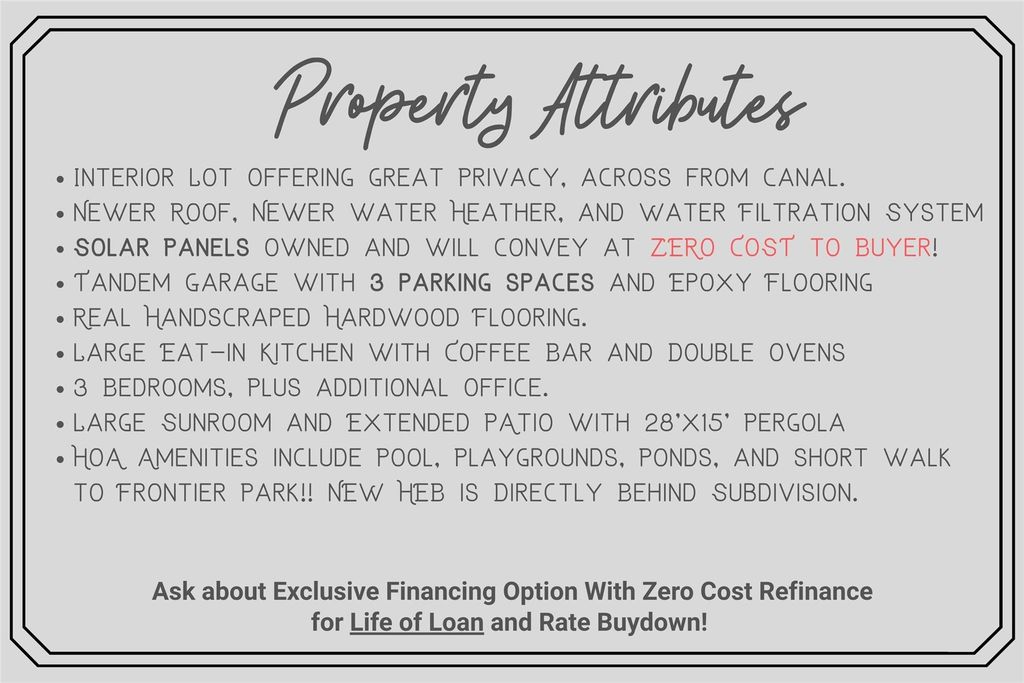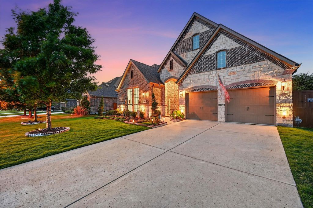 Beautiful 1-story home in desirable Lakes of Prosper! Grand foyer with tall ceilings & real hand scraped hardwoods lead you past the study with French doors, half bath & oversized dining room. Spacious family room features stone fireplace and custom accent wall that is open to the Chef’s kitchen. White custom cabinets, granite counters, SS appliances, under cabinet lighting, huge island, double ovens, large pantry & breakfast room make the kitchen the heart of this home. Primary suite has spa like bath with separate vanities, garden tub & large shower. Spacious walk-in closet connects to laundry room. Two private guest rooms separate from primary & living spaces. 4-season Sunroom provides flexible living looking out to huge back patio & entertaining area covered by a pergola. 3-car tandem garage w epoxy floor. New roof, water filter system, solar panels, and many other upgrades. Community pool & ponds! Walking distance to Frontier Park and Prosper High School. No MUD or PID! Ask your agent about exclusive financing options that leverage zero cost refinancing for life of loan.