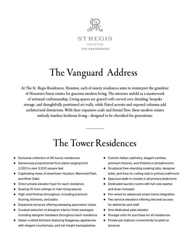The St. Regis Residences, Houston — an exclusive collection of 90 private residences — offers residents the timeless sophistication of the St. Regis legacy, with world-class amenities, bespoke interiors, and five-star service in residence. The 3.8 acres of secure, private, resort-like setting along the graceful Buffalo Bayou, offers panoramic views of Houston’s most cherished locations, including River Oaks, Rice Military, and the expanding downtown Houston Skyline. Owners enjoy legendary St. Regis butler service, valet, concierge, and access to over 40,000 square feet of private amenities. These include the Astor dining room and cognac bar on the 20th floor, a resort-style pool deck with cabanas, a state-of-the-art fitness area, spa, wellness center, owner’s lounge, pet spa, landscaped butterfly gardens, and full building generator backup. Every detail is curated to deliver the signature St. Regis lifestyle — refined, discreet, and service-driven.