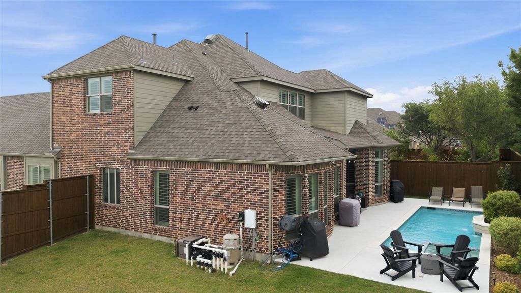 Situated on a private corner lot, this beautifully designed home offers the perfect blend of space, comfort, and functionality for modern living. The open-concept layout is ideal for busy households, featuring a chef-inspired kitchen that anchors the heart of the home and connects effortlessly to both dining areas and the inviting living space. Natural light fills the interior, highlighting wood flooring, upgraded lighting, and plantation shutters throughout. The main level includes three well-appointed bedrooms, thoughtfully arranged with the secondary bedrooms separated from the primary suite—an ideal setup for guests or multi-generational living. The primary retreat features an elegant coffered ceiling and a spacious ensuite bath with a generous walk-in closet. A private executive study with additional storage makes working from home convenient and comfortable. Upstairs, you’ll find a versatile living area complete with expansive game and media space, an additional study area, and a fourth bedroom with its own bath—perfect for visitors or extended stays. Step outside to enjoy year-round outdoor living under the covered patio, overlooking your private backyard oasis with a sparkling pool, spa, and grassy play area—perfect for relaxing evenings and entertaining. Additional highlights include a tankless water heater, radiant barrier, and a three-car garage. Conveniently located with quick access to parks, major commuter routes, universities, shopping, and dining, this home is part of a vibrant community featuring amenities such as a pool, playground, scenic trails, and a neighborhood pond.