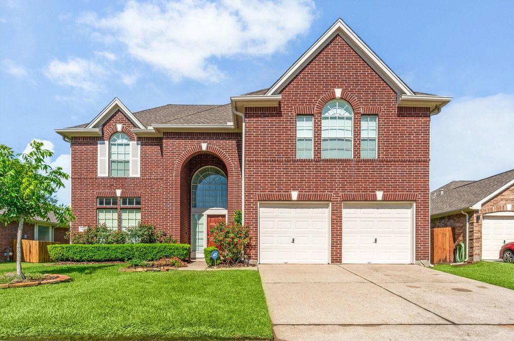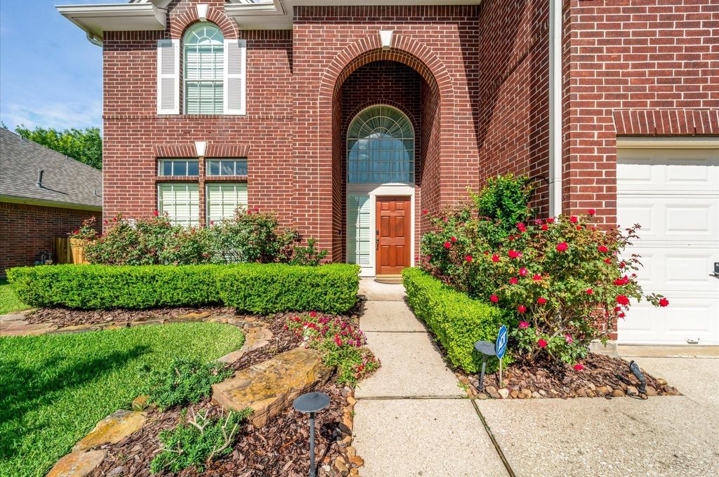 Move-in ready 4-bedroom, 2.1-bath brick home in the highly desirable Country Club Cove subdivision. Excellent curb appeal, lush landscaping & elegant arched entry make a warm, lasting impression. Inside features bright family & dining rooms, spacious living room with cozy gas fireplace, & open-concept island kitchen with new granite countertops & cabinets, breakfast bar, gas stove/oven & charming breakfast nook framed by a wall of windows. The primary suite is a true retreat with double vanities, soaking tub, separate shower & 2 walk-in closets. Upstairs offers large game room, 3 generously sized bedrooms & full bath with modern finishes. Additional highlights: main-level half bath, utility room with built-in shelving, 2-car attached garage & shaded backyard with deck & green space—perfect for outdoor entertaining. New roof, new hot water heater & new plush carpet in upstairs bedrooms & stairs. Close to schools, parks, restaurants & shopping.