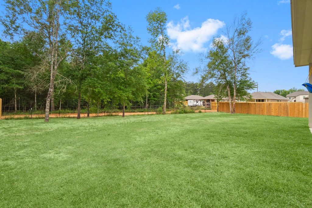 This lovely home is situated in the highly sought-after Deer Trail Estates, offering a prime location with no back neighbors and just minutes from I-45 and Lake Conroe. Built by First America Homes, this stunning home features 3 bedrooms, 2 bathrooms, and a study, all on a spacious lot. The gourmet island kitchen is a chef's dream with 36" cabinets, granite countertops, and stainless steel appliances. Relax in the spacious primary retreat, complete with dual sinks, a separate shower, and a soothing garden tub. Wood vinyl plank flooring flows throughout the main living areas, adding elegance and durability. Additional features include a sprinkler system, covered patio, and much more. The sizable backyard provides plenty of room for a future pool or outdoor relaxation. With a super low tax rate and HOA, this community is a remarkable find. Don't miss out on this exceptional home!