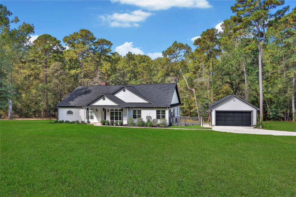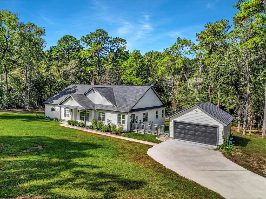 Beautifully remodeled 1-story white brick home on 2+ acres backing to nature in the hidden gem subdivision of Cimarron Country. Private driveway leads to this 4 bed/2-bath home featuring high ceilings, crown molding & LVP flooring throughout. Open concept living area offers wall of windows showcasing serene outdoor views. Spacious, modern kitchen includes granite countertops, farmhouse sink, custom cabinetry, backsplash, wine fridge & new appliances, including 8-burner gas cooktop w/griddle, flowing seamlessly into the dining area. Primary suite features abundant natural light, sitting area & luxurious ensuite bath with frameless shower & large walk-in closet. Two secondary bedrooms share updated full bath, plus flexible 4th bedroom option. Private office with built-ins. Outside, detached 2-car garage, patio w/extended deck and whole-home generator. Additional updates including new roof (2024), plumbing & electrical fixtures, sprinkler controller (2022) and more; see attached list.