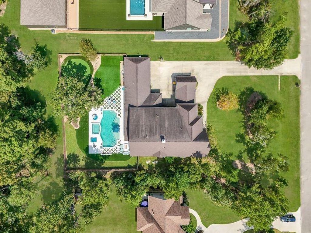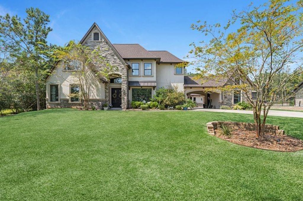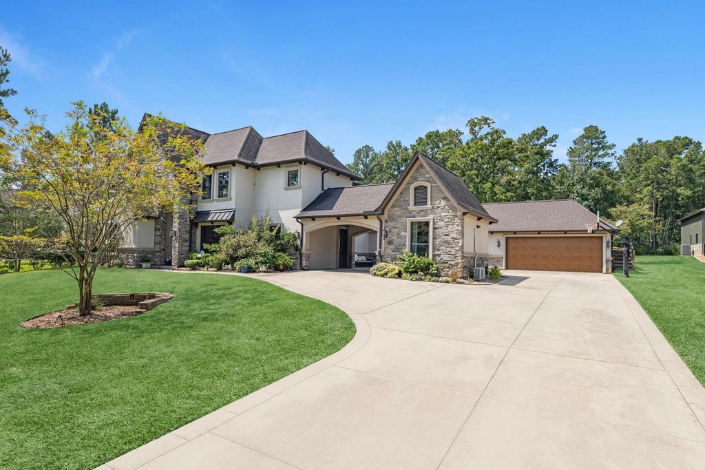 Stunning custom home on over an acre in the gated Edgewater section of Ridgelake Shores! This beautifully designed home offers striking curb appeal with a circular drive and porte-cochere. Inside, enjoy soaring ceilings, expansive windows, and fine finishes throughout. Gourmet kitchen features custom cabinetry, leathered quartzite island, and opens to a spacious living area with floor-to-ceiling stone fireplace. Formal dining with stone and wood archway leads to elegant wine grotto. Perfect for entertaining with a second living area and wet bar, theater room with projector, hidden game room, built-in bunk room, and large covered patio overlooking private, scenic grounds. Converted one car garage with AC. A truly exceptional home with custom details throughout! Step out back to find your true oasis. Newly built and custom pool with firepit, outdoor kitchen and a putting green! This home checks every box! You don't want to miss out on this gem!