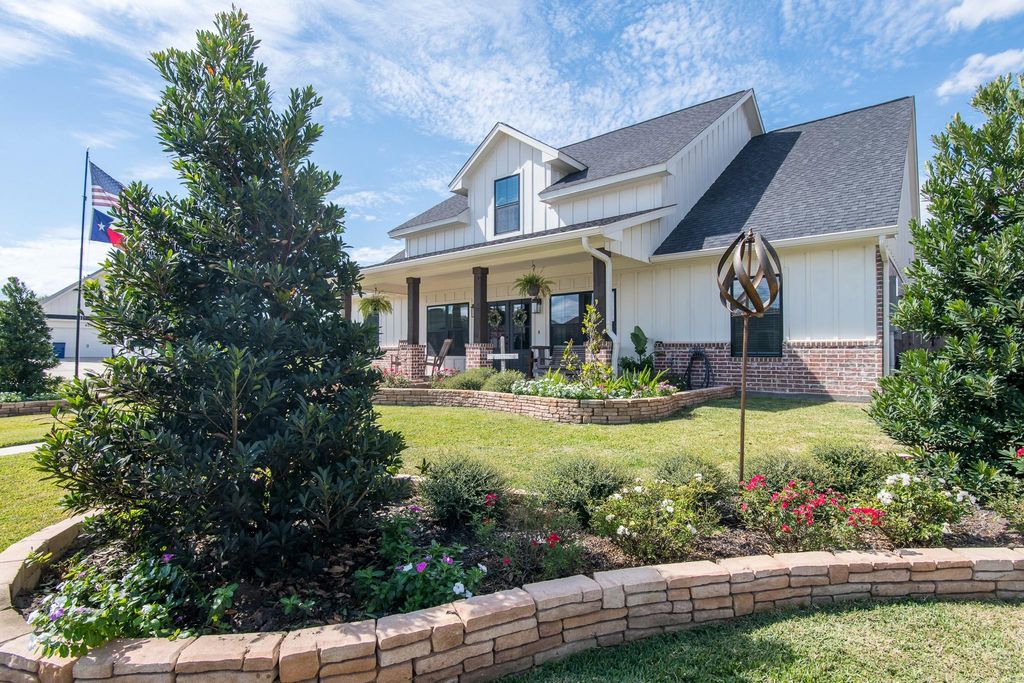 Welcome home to this stunning farmhouse style 4-bedroom 3-bath on a spacious corner lot! This thoughtfully designed floor plan features an open-concept living, kitchen, & dining area perfect for entertaining. The kitchen offers an oversized island with breakfast seating & a huge walk-in pantry with custom shelving. The primary suite plus two guest bedrooms are conveniently located downstairs, while the upstairs retreat includes a large game room, fourth bedroom, & full bath. Enjoy a private backyard with a bricked back porch that beautifully matches the front, surrounded by upgraded landscaping & a privacy fence. Over $80,000 in thoughtful upgrades include: gutters, sprinkler system, expanded driveway, whole-house water softener, reverse osmosis system, HVAC air purifier, generator, updated upstairs bathroom, new vanity lights in all baths, ceiling fans in guest rooms/game room, & more! Expanded driveway with 3 extra parking spots giving plenty of space—this home truly has it all!!