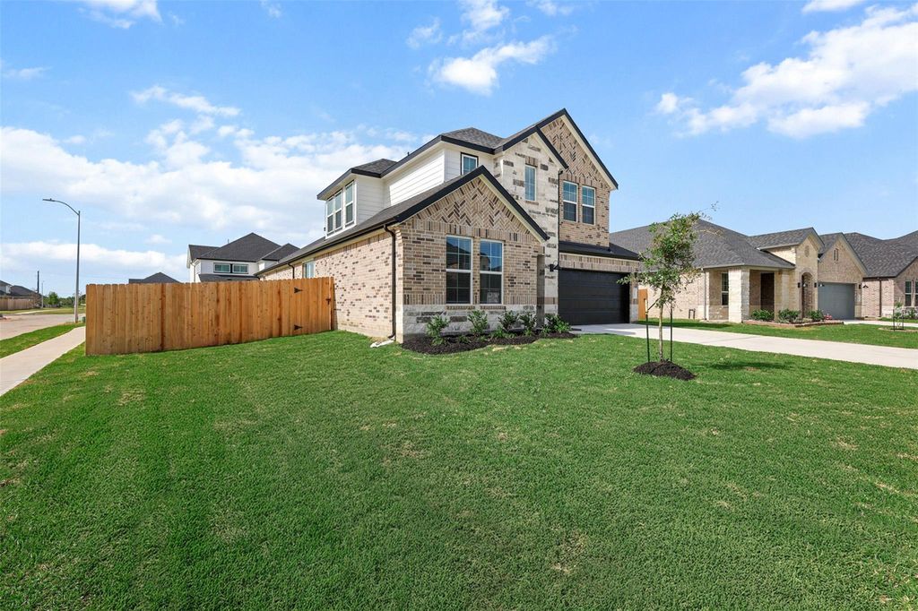 Beautiful New 2-story traditional home on a large corner lot featuring brick & stone elevation! Outstanding Schools! Inviting custom door opens to an amazing entry with high ceilings & stylish vinyl plank wood floors. Just off the entry to the left is a private guest suite with its own full bathroom, perfect for visitors or extended family. French doors open to the home office ideal for working from home. Spacious 2 story family room filled with natural light flows into the open concept kitchen & casual dining. Gourmet kitchen features gorgeous quartz counters, Tall shaker cabinets with undermount lighting, large eat in island, built-in stainless-steel appliances & more! Private primary suite with a dramatic spa bath with dual sinks, deep soaking tub, seamless glass shower, & walk in closet. Upstairs is a large game room & 2 additional bedrooms with a full bath. Energy Star home, tankless water heater, sprinkler system & covered patio. Smart Home Automation Home! Not in a flood zone!