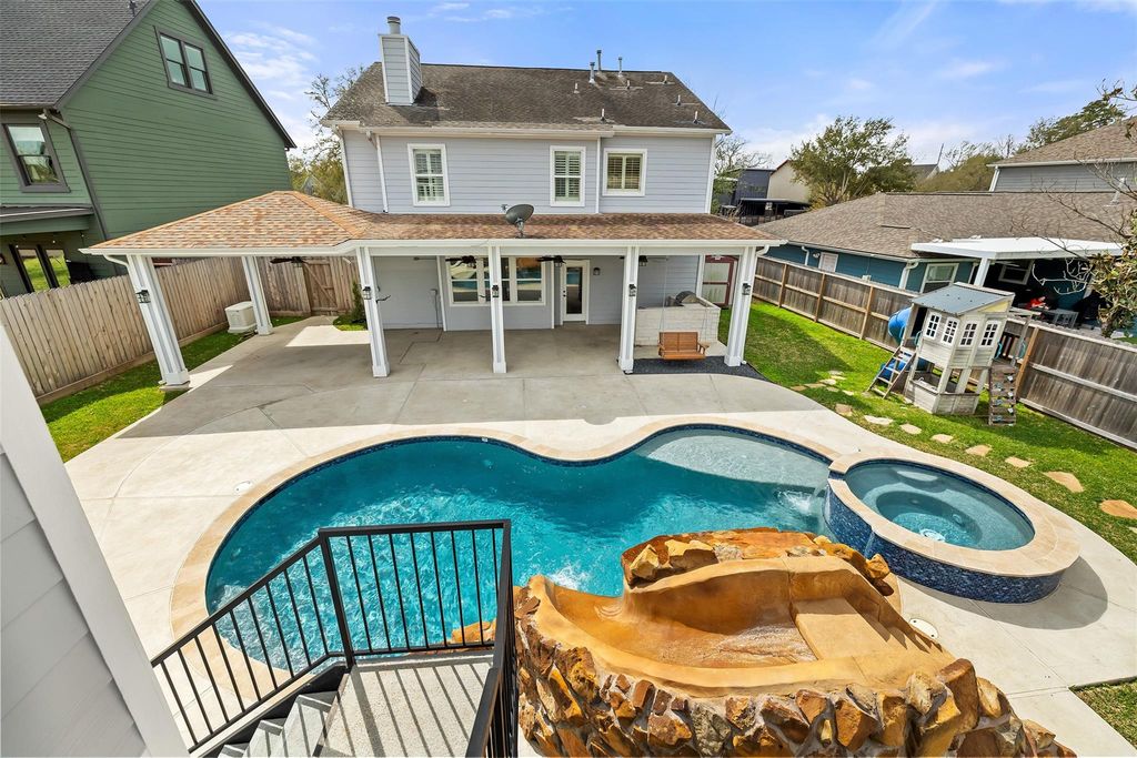 Great location in Oak Forest, this beautiful home features multiple upgrades, stand-by generator, pool and 2-story guest or pool house. Recently updated kitchen is open to the family room with builtins and cozy fireplace. A wall of windows views the large covered porch and stunning pool. The primary suite is large with a fireplace. The bathroom has double sinks, shower, soaking tub and a walk-in closet. 2 or possibly 3 additional bedrooms are up along with the utility room with folding area. 3rd floor bonus room, can be used for a gym/ play area or media room. Enjoy the inviting pool with waterfall and slide. The separate guest suite or pool house has a full kitchen, eating area, pool bath down and apartment up with loft-style bedroom, living and full bathroom. The spacious garage has an epoxy floor, overhead storage and additional storage closet. Walk to neighborhood parks, retail and restaurants.
