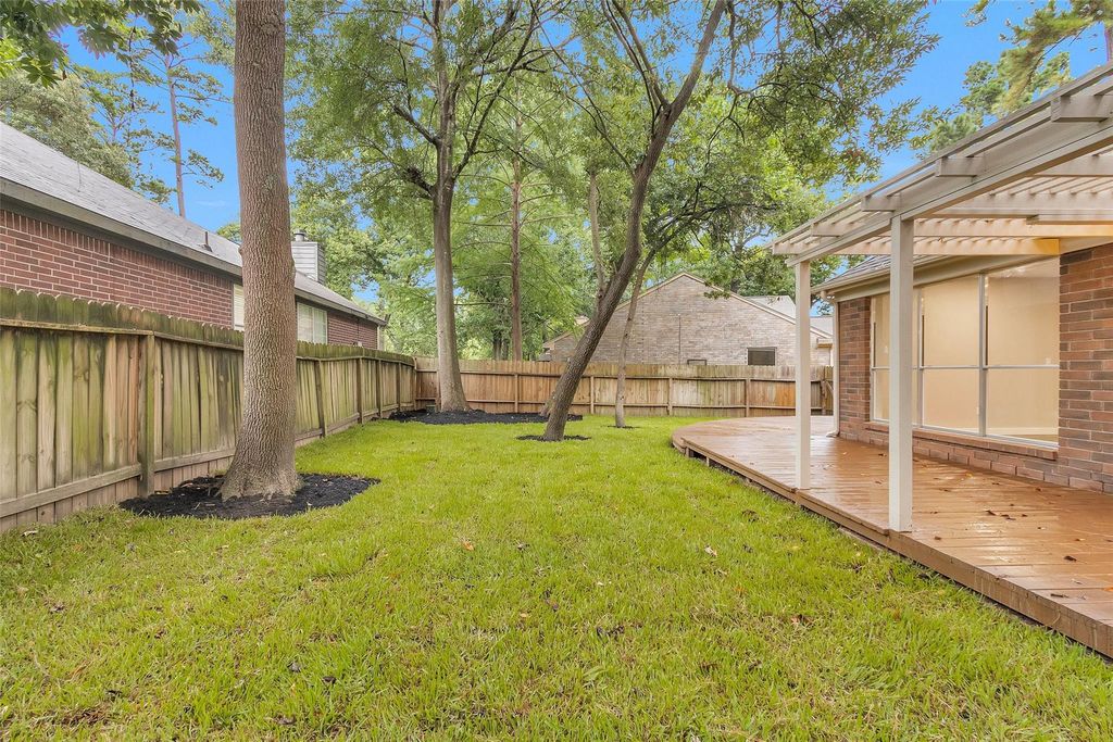 Exquisite 3/2 home in Villages of Grogan's Mill with modern upgrades including porcelain tile, granite countertops, and recessed lighting. Natural light floods the spacious interior, creating a serene ambiance. Enjoy the updated deck and fully fenced yard on a peaceful corner lot in a cul-de-sac. This private oasis offers a perfect retreat.