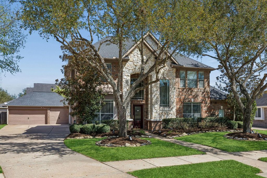 Rare opportunity in Grand Lakes featuring a private Teen Suite/Garage Apartment with full bath and oversized loft, offering flexibility for multigenerational living, long-term guests, or a private retreat for teens. This beautifully maintained two-story Trendmaker home offers 5 bedrooms, 5 full baths, dedicated home office, spacious gameroom, and elegant dining area all set on an oversized cul-de-sac lot with peaceful lake views. The first floor features rich wood flooring and a kitchen with a breakfast bar opening to the living spaces. The primary suite includes a beautifully renovated spa-inspired bath with stand-alone soaking tub, dual spa shower heads, dual vanity, and separate closets. Step outside to a heated gunite pool and oversized spa, creating a private backyard escape. Major updates include roof (2019), two 50-gallon water heaters, and new 5-ton HVAC (2024). Walking distance to the neighborhood elementary school and minutes from Grand Lakes parks, lakes, and trails.
