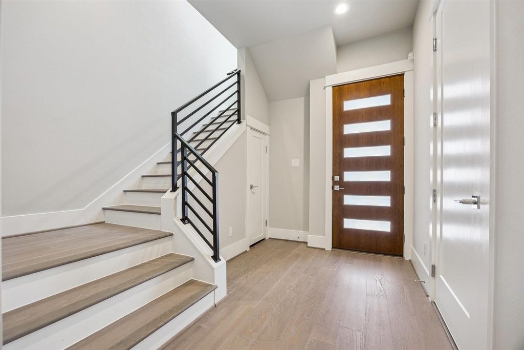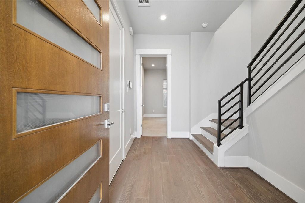 Live beautifully in this sunlit 3-story contemporary inside a gated Midtown/Museum District community. 3 beds/3.5 baths and an open second-floor living level with soaring ceilings, warm wood floors, and a quartz-island kitchen with custom soft-close cabinetry, glass backsplash, upgraded Bosch appliances, and a 5-burner gas range, perfect for weeknight cooking and weekend entertaining. Retreat upstairs to a serene primary suite with soaking tub, separate shower, and dual walk-through closets. First-floor guest suite with private bath is ideal for visitors, a roommate, or WFH. Savor morning coffee on the balcony with sparkling Downtown views. Practical perks: 2-car garage, outdoor storage, washer/dryer, 4-door refrigerator with separate freezer, mini beverage fridge, and a mounted 80" Sony Smart TV with console. Minutes to the Rice/Museum District, Hermann Park, METRORail, Downtown, and the Texas Medical Center; quick access to I-69, 288, and I-45, commute-easy and weekend-ready.