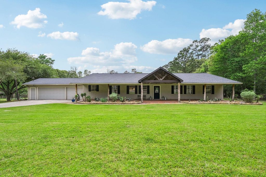 Beautiful acreage retreat in Stagecoach! Situated on 3.785 serene acres backing to a creek, this property spans 3 lots and offers privacy, space, and room for horses (previously accommodated). This 1-story home features 3 bedrooms (one currently used as a study), a flex room, dining area, and a spacious family room. Major updates include: new roof with transferable warranty (2025); full kitchen and living room remodel, primary bath remodel, whole home re-piped with PEX, and flooring upgraded (2021, ~$100K); sprinkler system installed (2018). LPG tank on site is currently rented. Enjoy outdoor living with large covered front and back patios. The property also includes horse stalls, a workshop (~600 sqft), and extra parking behind the garage. The oversized 3-car garage (~840 sqft) features drive-through doors and a half bath—perfect for projects or added flexibility. Low HOA ($50/yr), No MUD, automatic gated driveway, and private neighborhood lake access complete this unique offering.