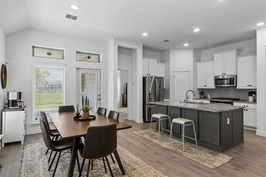 The versatile front room next to the extended entryway is ideal for a home office or guest bedroom—perfect for today’s flexible lifestyle. The open-concept layout offers a spacious living area and a dining space large enough for gatherings, making it ideal for both everyday living and entertaining. The modern kitchen features a large island, quartz countertops, upgraded cabinetry, an upgrade Kitchen-Aide dishwasher, and a high-end 5-burner gas range, appealing to buyers looking for a move-in ready home with an updated kitchen.