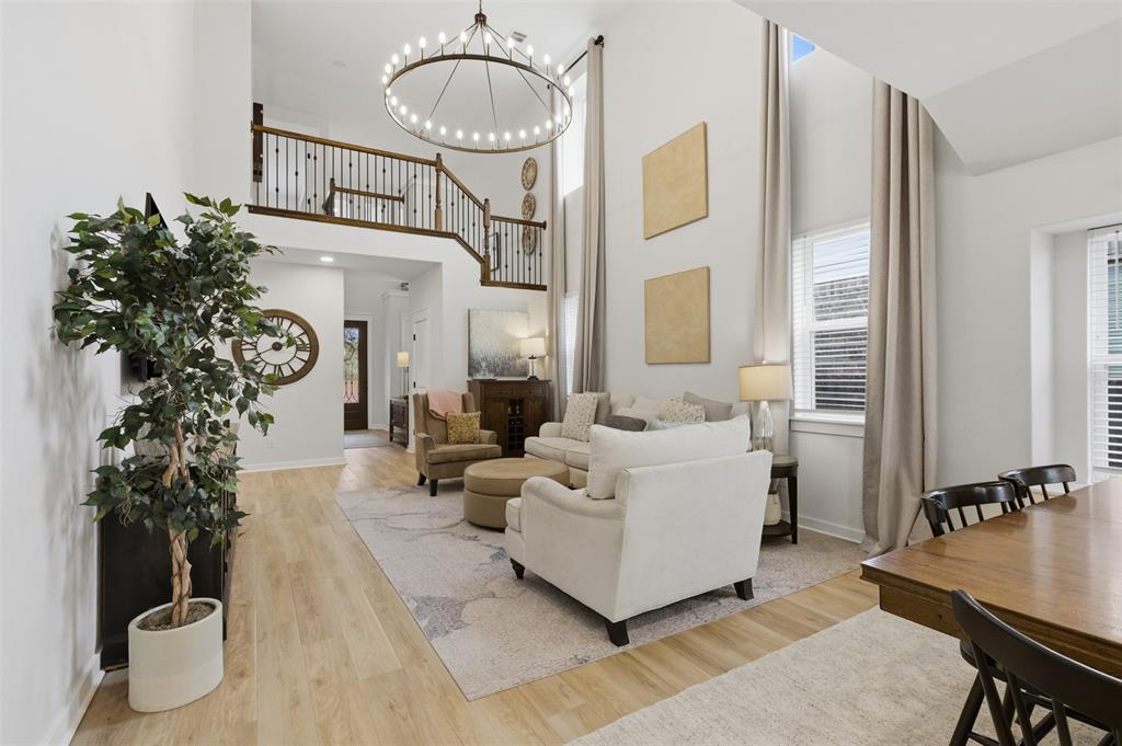 Stylish and beautifully maintained, this home in the desirable Oaks at San Gabriel neighborhood offers exceptional curb appeal with easy-to-maintain landscaping and a charming tree out front. Inside, an open floor plan showcases soaring ceilings, expansive windows, and gorgeous wood-look luxury vinyl plank flooring throughout the main living areas. The living room features a striking chandelier and flows seamlessly into the dining and kitchen spaces, where you’ll find quartz countertops, a center island with bar seating, elegant white cabinetry with pullout drawers, stainless steel appliances, and a spacious pantry. A convenient half bath tucked under the stairs on the main level adds extra functionality for guests. The primary bedroom provides a relaxing retreat with a walk-in closet with built-ins and an ensuite bath complete with a dual vanity and frameless glass shower. Upstairs, three additional bedrooms offer flexibility for guests, a home office, or hobbies—one even includes balcony access—and all share a well-appointed full bath. Step outside to a spacious fenced backyard with a covered patio and dedicated garden beds, plus plenty of room to add a pool. Residents enjoy access to fantastic community amenities including a pool, pavilion, parks, playgrounds, picnic areas, and scenic trails. Conveniently located near shopping, dining, and recreation, with easy access to Hwy 29, Hwy 183, and I-35, this home truly has it all.
