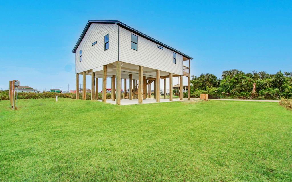 Furnished Beach House on the Peninsula, on the South side of Galveston East Bay, 3 minutes from the beach. New custom built home with approved elevation over 14 feet. Double glass sliding doors on each side of the double glass front door provide ample natural light. Spray cell foam insulation on walls, roof & floor offer incredible energy efficiency. Kitchen boasts brand new Bespoke high end appliances, wine cooler, onyx counters, custom cabinets, spice rack, chef's prep sink, wine rack, and coffee bar. Living room offers TV, surround sound system, and acoustic panels. Washer and dryer in utility room, tankless water heater. Bedrooms have walk-in closets. Bathrooms have floating vanities & frameless glass showers. High ceilings, SPC floors are waterproof & scratch resistant. RV storage. NO HOA, LOW TAXES, VACATION RENTAL. Home has anaerobic septic system. Home is wind and flood storm certified. 7 minutes from Margaritaville. Ideal for entertaining, space and luxurious features.